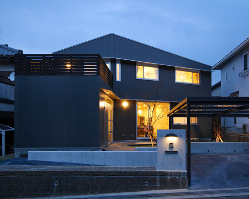 建物の長辺は真南に正対するよう配置し、玄関のある短辺部は敷地に直交する平面計画とした。これは街並みに配慮する意味と、西日を遮り、庭のプライバシーを確保する狙いもある。